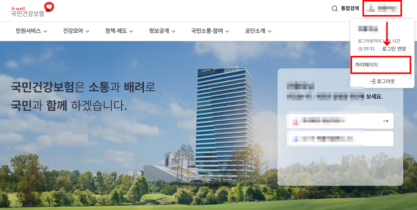 - 건강보험공단 홈페이지 접속 후 로그인