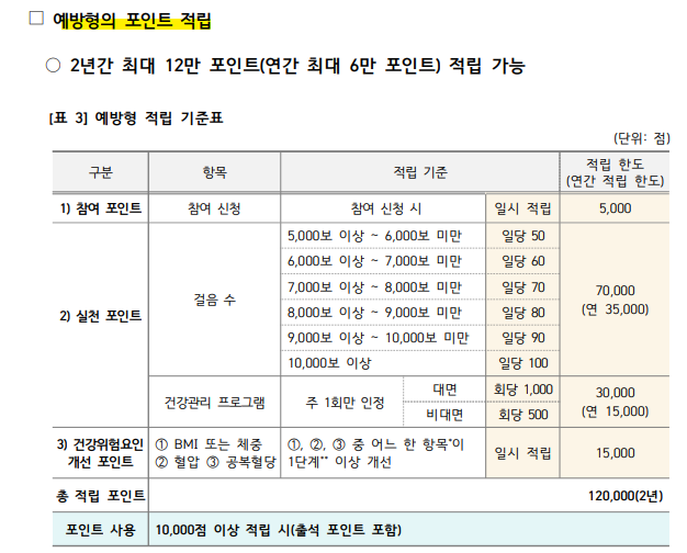 예방형은 최대 12만 점(1년 6만점, 최대 2년), 관리형은 최대 8만 점까지 포인트를 적립할 수 있습니다. 포인트 적립 내용은 아래를 참고해주세요.