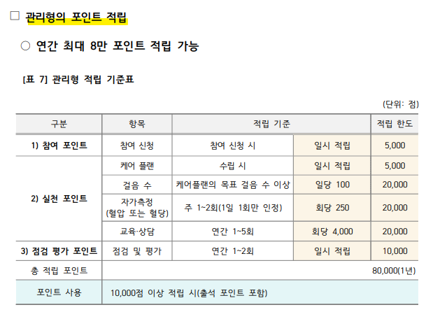 - 관리형은 보통 1년 단위 참여, 총 80,000점 수준의 포인트 적립이 가능하며, 자가 건강 측정, 교육·상담 참여 등을 통해 포인트를 쌓을 수 있습니다.
