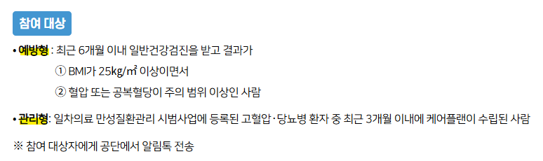 (예: BMI 25 이상, 혈압/공복혈당 주의 이상) - 예방형은 시범지역 거주자에게 우선 적용되며, 최근 건강검진 결과를 활용하여 자격이 판정됩니다.