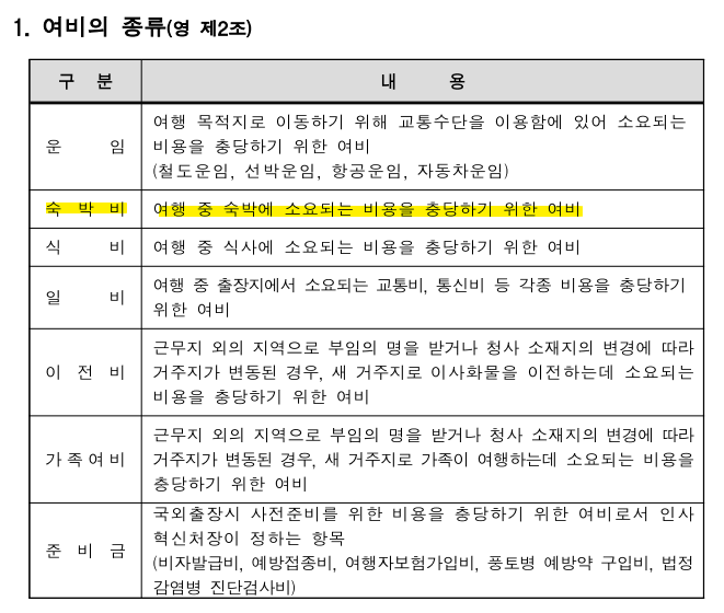 출장 중 숙박에 소요되는 비용을 보전해 주는 항목이 바로 숙박비입니다. 여비규정 제 16조 제1항에서는 “국내여행자의 일비·숙박비 및 식비는 별표 2, 국외여행자의 경우는 별표 4에 정하는 바에 따라 정액으로 이를 지급한다”고 명시되어 있습니다.