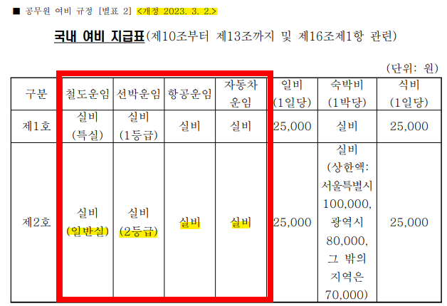 예컨대 국내출장 시 ‘제1호’ 대상(고위직)과 ‘제2호’ 대상(일반직)으로 구분되어 있으며, 제1호는 특실·1등석·비즈니스석 등이 가능하지만 제2호는 일반실·이코노미석 적용이 통상입니다. 또한 자가용을 이용한 경우에는 ‘자동차운임’ 대신 연료비·통행료·주차료 등의 지급이 가능하다는 규정이 있습니다.