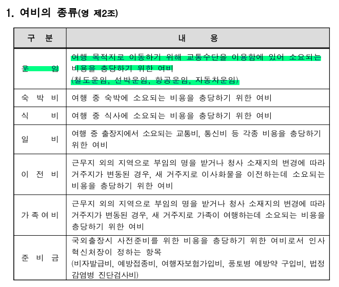 공무원 여비규정 교통비(운임)