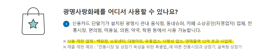 특히 광명시에서는 연매출 10억 원 이하의 소상공인 업체, 카드 단말기가 설치된 업체 등에 사용이 가능하며 백화점·대규모 유통점·유흥업소 등 일부 업종에서는 사용이 제한될 수 있습니다.