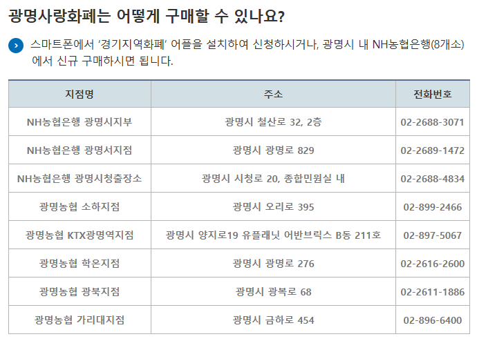• 광명시 내 농협은행 등 오프라인 판매처에서 즉시 구매도 가능합니다.