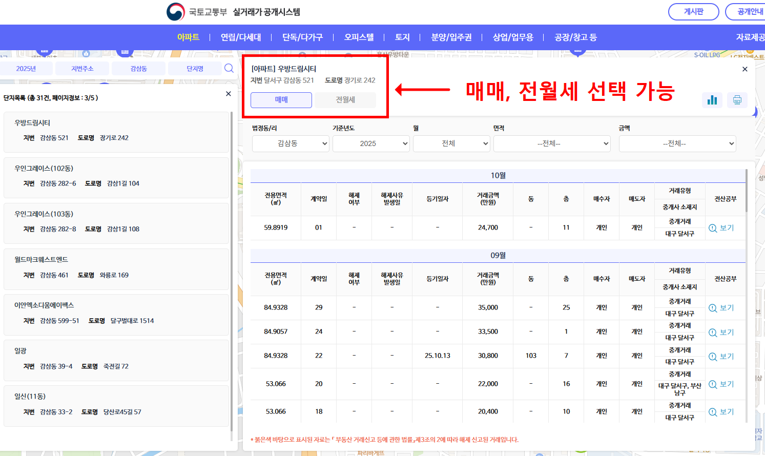 - 매매, 전월세 중 원하는 거래 유형을 선택합니다.