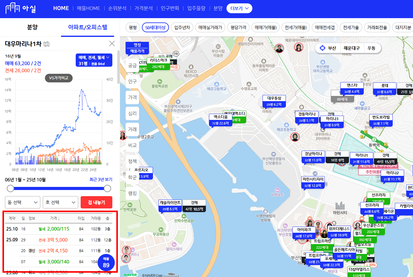 최근 1개월, 6개월, 1년 등 조회하고 싶은 기간을 선택하면 해당 기간의 실거래가 리스트가 나옵니다. - 결과 확인
