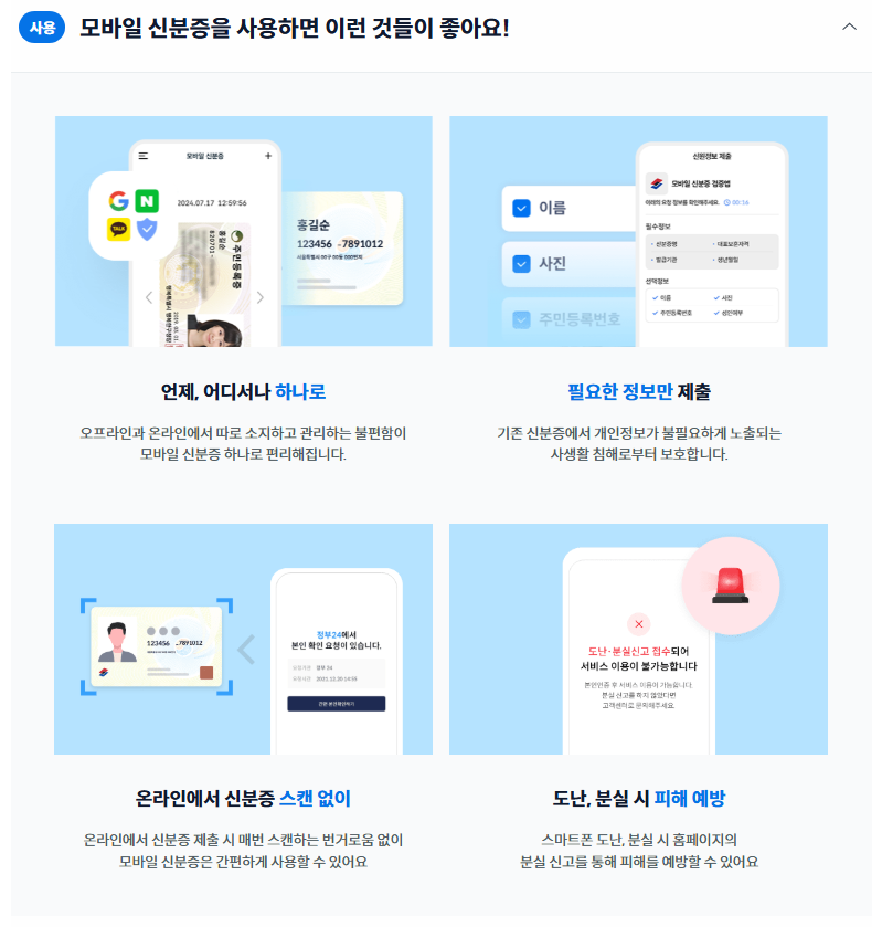 | 필수 준비물 | IC 주민등록증(온라인, 스마트폰(안드로이드/iOS 지원) |