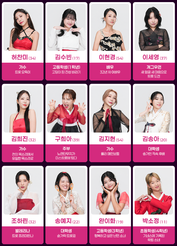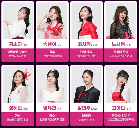 - 현역 트로트 가수, 신인 가수, 일반인 참가자 혼합 구성