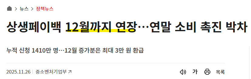 정부는 소비 진작과 내수 회복을 위한 상생소비지원금(상생페이백) 정책을 2025년 12월까지 연장하기로 확정했습니다. 원래 9월부터 11월까지 시행 예정이었으나, 소비자들의 높은 관심과 참여를 바탕으로 한 달 추가 운영을 결정한 것입니다.