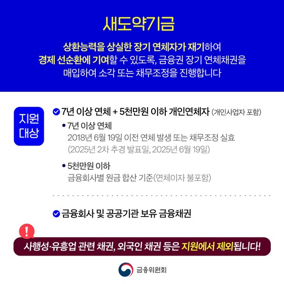 즉, “7년 이상 연체 + 원금 5천만원 이하 + 상환능력 없음”이라는 조건을 모두 갖춘 경우라면 새도약기금을 통해 빚 탕감 가능성이 열립니다.