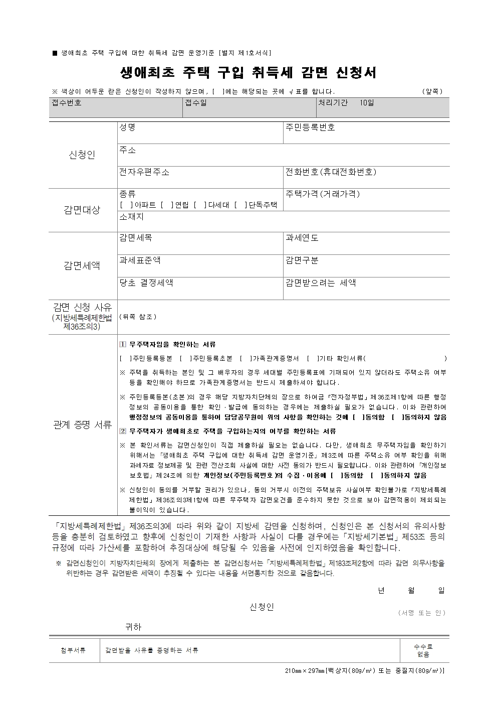 - 생애최초 주택구입 취득세 감면 신청서 (지방세 감면신청서)