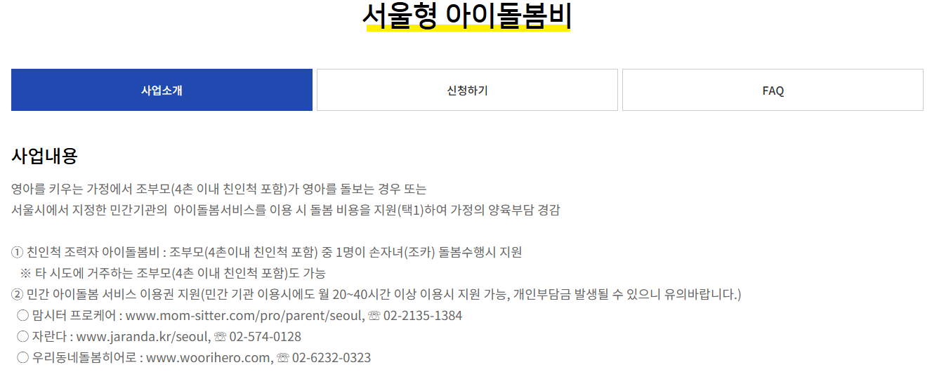 - 대상: 만 24~36개월 영아의 손주, 부모와 아동 모두 서울시 거주, 중위소득 150% 이하, 맞벌이 또는 양육 공백 가정. 돌봄 제공자는 조부모 또는 4촌 이내 친인척.