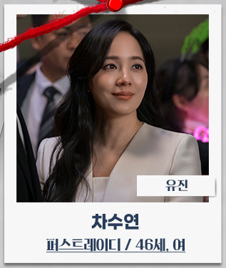 - 차수연(유진) : 대통령 당선인의 아내, 주인공. 권력과 사랑을 모두 지키려 하지만 남편의 배신으로 갈등 시작.