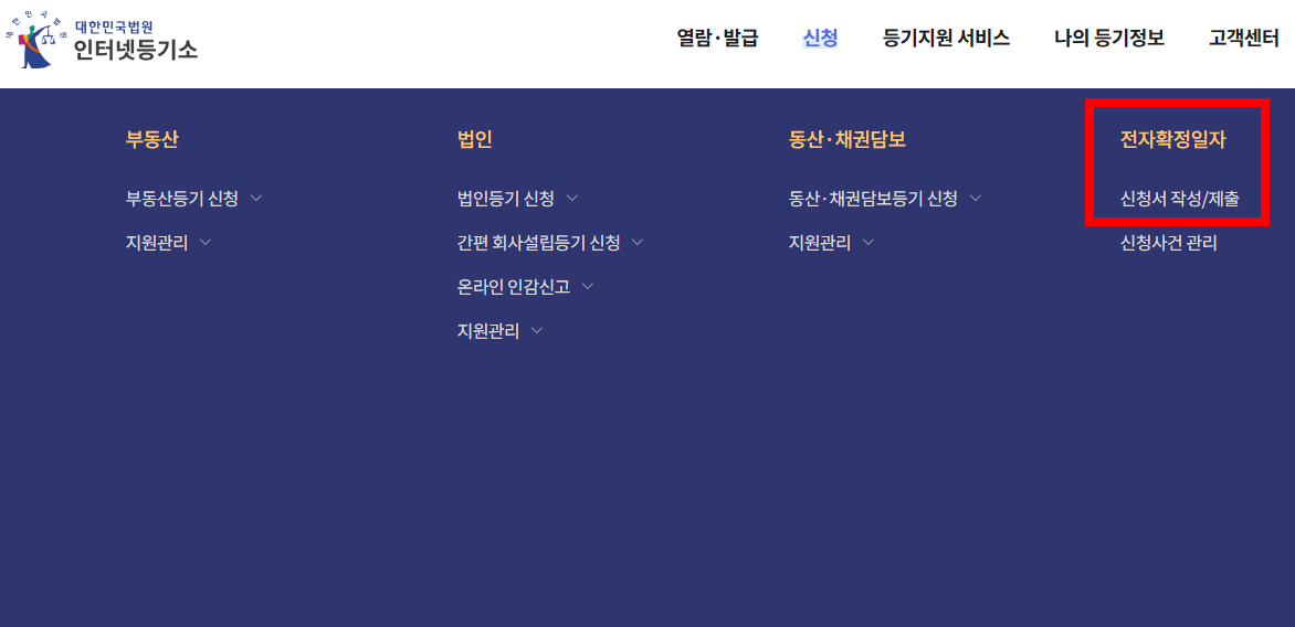 1) 먼저, 인터넷등기소에 접속한 후 상단 메뉴에서 ‘신청' 메뉴를 클릭합니다.