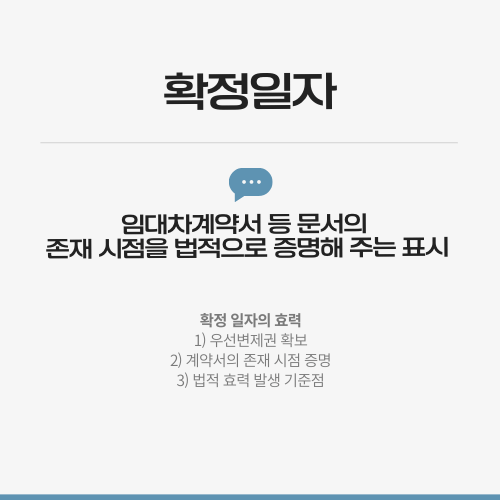 '확정일자'란 임대차계약서 등 문서의 존재 시점을 법적으로 증명해 주는 표시로, 해당 문서가 특정 날짜에 존재했음을 공식적으로 인정받는 것입니다. 주택임대차보호법에 따라 임차인이 보증금을 보호받기 위해서는 전입신고와 확정일자를 모두 갖추어야 하며, 이를 통해 대항력과 우선변제권을 확보할 수 있습니다.