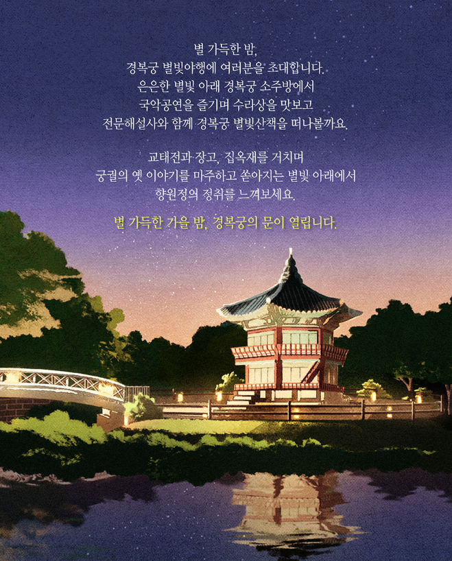 경복궁 별빛야행은 조선 왕실의 밤을 체험할 수 있는 특별한 고궁 야간 프로그램입니다. 낮에는 볼 수 없던 비공개 구역을 해설사와 함께 둘러보고, 궁중 음식을 맛보며 전통 공연까지 즐길 수 있어 매년 큰 인기를 끌고 있습니다.