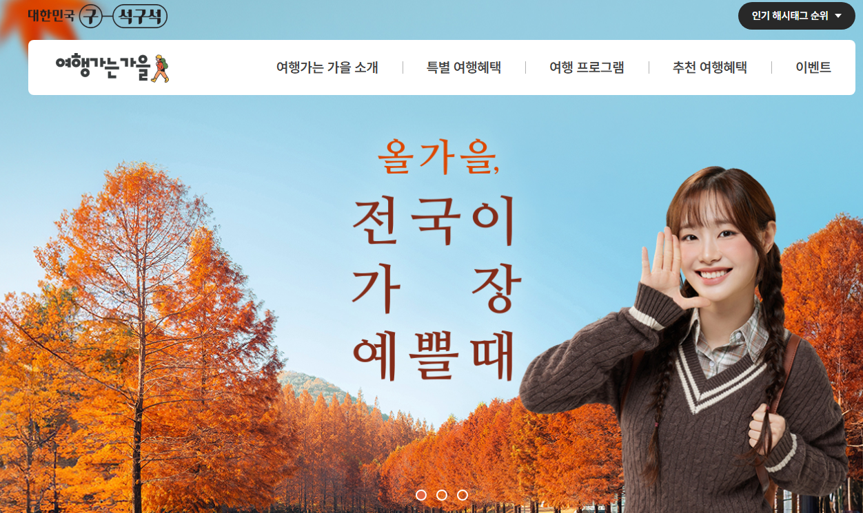 여행가는 가을 캠페인은 문화체육관광부 주관의 범국민 여행캠페인으로 2025년 11월까지 전국 국내 여행 활성화 목적으로 시행됩니다. 교통혜택과 숙박혜택, 가을여행 특별전으로 구성되어 있으며 다양한 이벤트를 펼치고 있습니다.