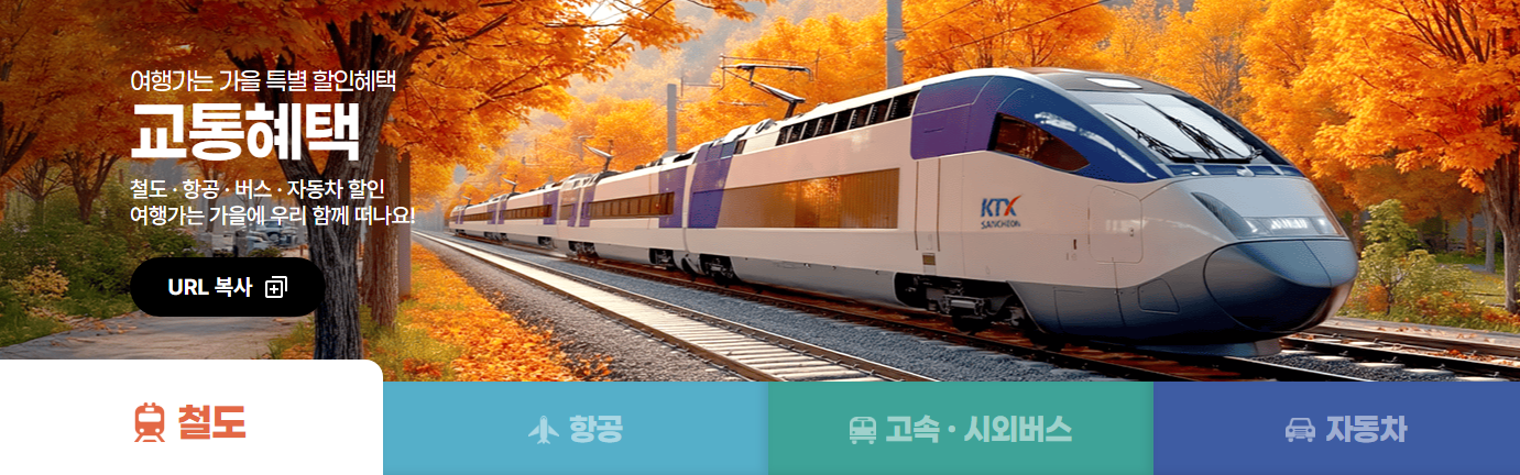 여행가는 가을 캠페인에서는 철도, 항공권, 버스뿐 아니라 자동차로 여행할 때도 할인 프로모션을 진행하고 있습니다. 이를 잘 확인하셔서 여행한다면 많은 비용을 줄일 수 있습니다.