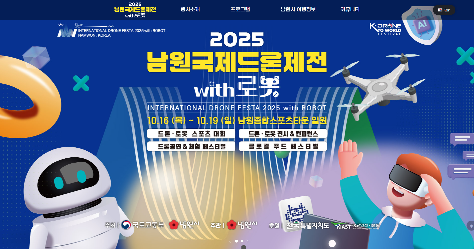 | 남원 국제드론제전 | 전북 남원시 | 2025.10.16 ~ 10.19 | 드론 퍼포먼스, 로봇 전시, 미래 기술 체험, 푸드 페스티벌 |