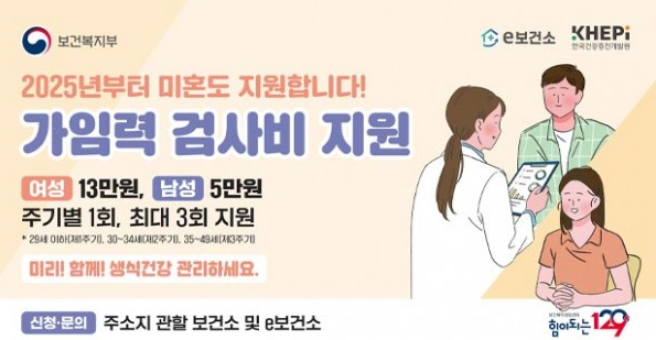 2025년부터는 보건복지부 주도로 가임력 검사비 지원 사업이 확대되어, 미혼·기혼 구분 없이 20세부터 49세 남녀 누구나 최대 3회까지 검사비 일부를 지원받는 제도가 시행됩니다.