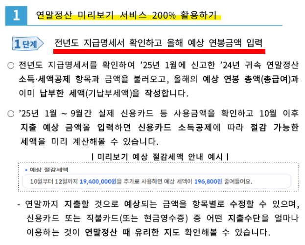 2025년에도 이 서비스가 11월 5일부터 시작되어, 1~9월까지의 카드 사용액과 지난 해 공제 내역 등을 바탕으로 환급 또는 추가 납부 예상액을 사전에 계산해볼 수 있도록 돕고 있습니다.