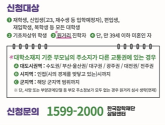 지원 대상은 기초생활수급자 또는 차상위계층으로 확인된 자이며, 부모님 주소지를 포함한 ‘원거리 거주’ 요건을 충족해야 합니다.