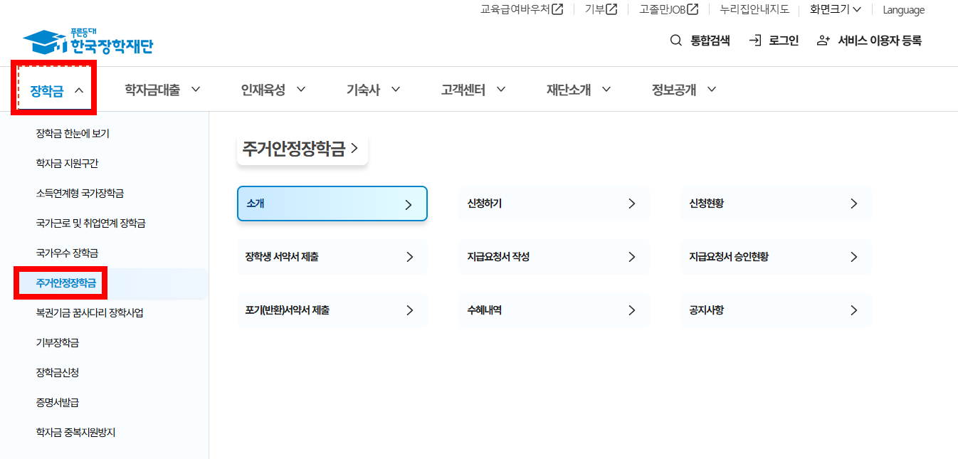 • 한국장학재단 홈페이지 또는 모바일 앱 접속 → 상단 메뉴에서 ‘장학금 신청’ 선택 → 목록에서 ‘주거안정장학금’을 클릭합니다.