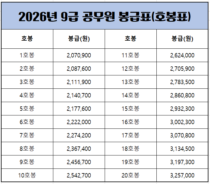 2026년 9급 공무원 월급표와 실수령액을 인사혁신처 인상률 기준으로 정리합니다. 2025년 봉급표와 비교해 본봉‧수당 변화를 분석하고, 공무원 복지 혜택과 민간 대비 보수 수준 변화까지 살펴보는 한눈에 보는 가이드입니다.