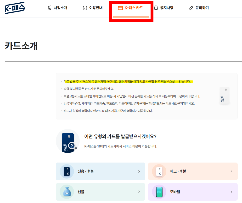 • 먼저 K‑패스 제휴 카드사에서 K‑패스 카드를 발급받아야 합니다.