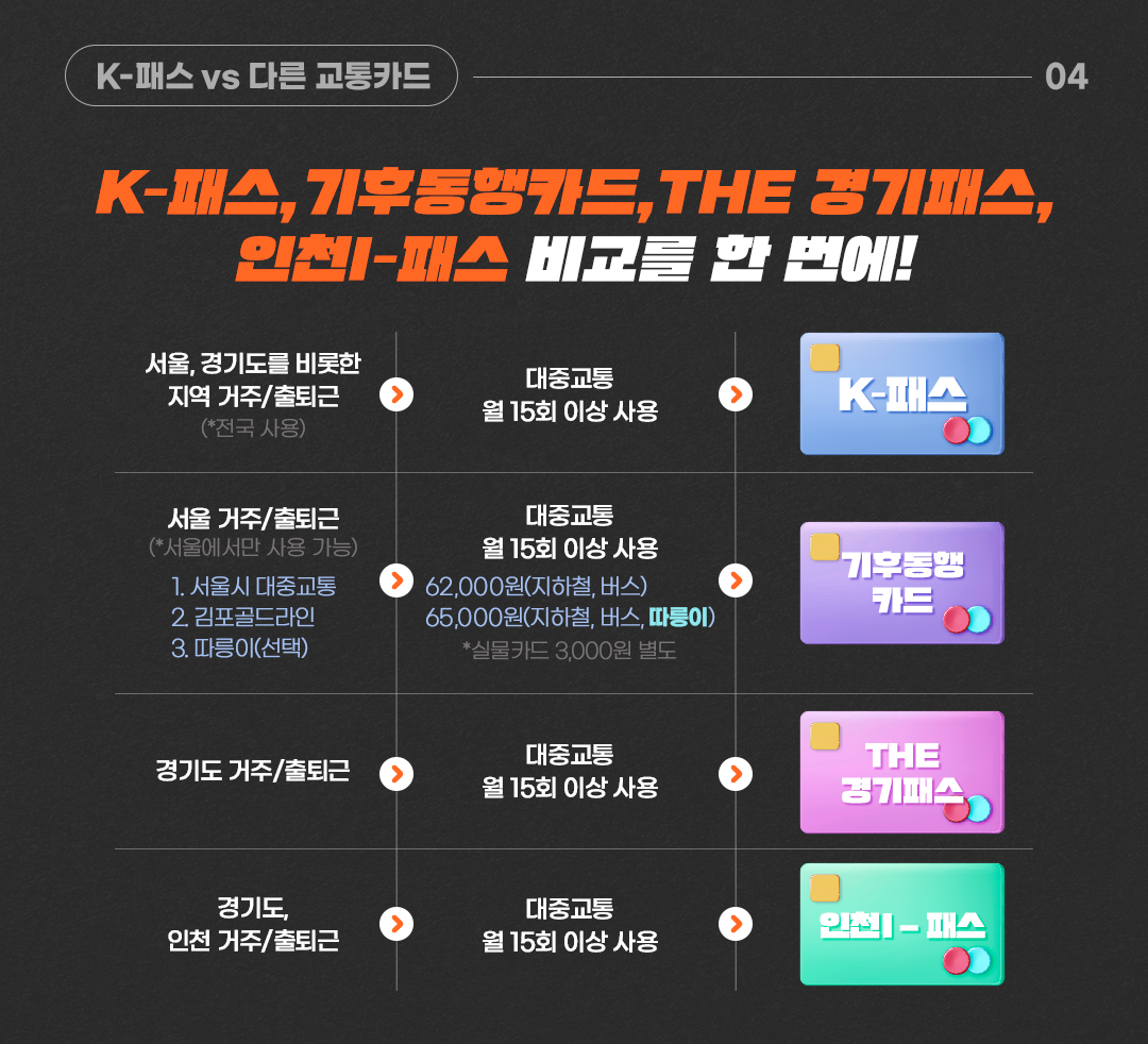• 카드사별 신용카드·체크카드 등 다양한 형태가 있으므로, 자신의 이용패턴(출퇴근·통학 등)에 맞춰 선택하는 것이 좋습니다.