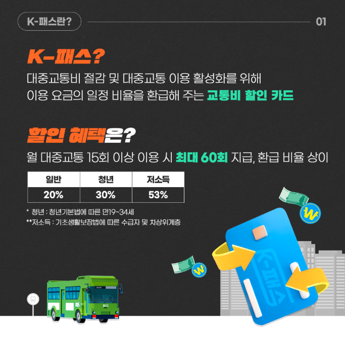 K‑패스는 국토교통부가 시행하는 대중교통비 절감 및 이용 활성화 정책입니다. 즉, 버스·지하철 등 대중교통을 일정 횟수 이상 이용하면 이용 요금의 일정 비율만큼 환급해 주는 제도입니다.